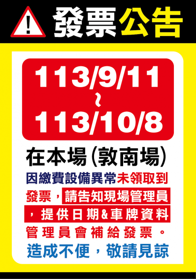 停車場地址:台北市大安區敦化南路二段46號 如於民國113年09月11日(三)~10/08(五),因現場繳費異常,導致繳費機台無法正常出發票, 繳費後如未領取到發票 即日起,可現場領取,請找現場管理員,提供停放日期及車牌資料,會補給發票,感謝您的配合。 造成不便,敬請見諒 ☎ 2754-6661